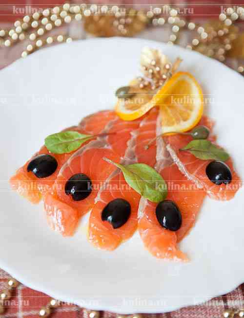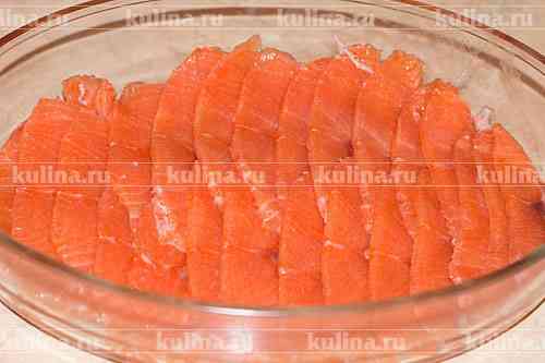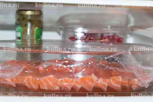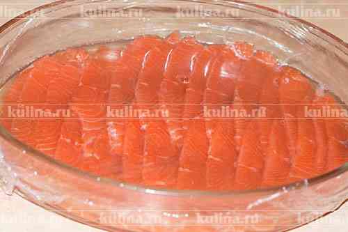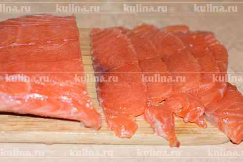 Рыбу разморозить в холодильнике но так, чтобы она оставалась чуток подмороженной, нарезать тонкими ломтиками..