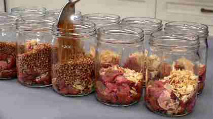 У меня мясо нежирное, поэтому я добавила еще по 1 ч.л. топленого масла в каждую банку. Если готовлю со свининой, например - масло не добавляю.