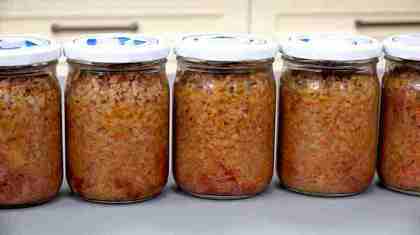 Перемешиваю, чтобы специи распределились, и раскладываю мясо по баночкам (~ по 150 г). Затем в каждую банку - по 1 ч.л. сухого жареного лука,
