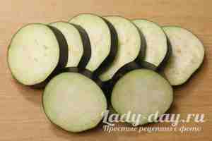 Не очищая от кожицы, нарезаем баклажаны кругляшками толщиной около 2 см. Очень тонко резать не стоит, так как при обжарке кружочки