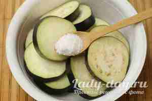 Пересыпаем баклажаны солью, перемешиваем руками. Оставляем на 20-30 минут, чтобы вместе с солью уходил горьковатый сок. Затем обдаем холодной