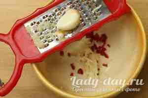 Пока жарятся баклажаны, готовим острый соус-заливку. Мелко рубим часть стручка острого перца, вырезая семена. Чесночные зубцы трем через мелкую