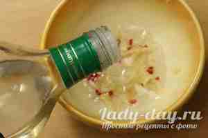 Добавляем ложку масла, подсаливаем по вкусу, вливаем уксус. Все компоненты соуса интенсивно взбиваем вилкой до загущения.