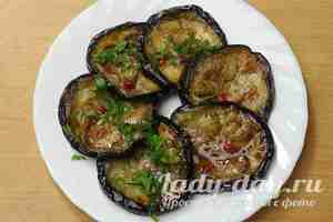 Выкладываем обжаренные баклажаны слоями, промазывая каждый кружок чесночно-перечным соусом и пересыпая зеленью.