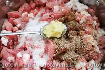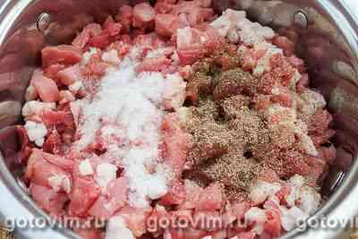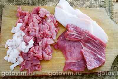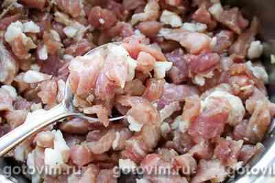 Свинину нарезать мелкими кусочками. Именно нарезать, мясорубкой лучше не пользоваться, она перетирает мясные волокна, и вкус получается совершенно другим.