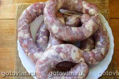При помощи мясорубки с насадкой в виде трубки наполнить тонкие свиные кишки подготовленным фаршем. Стараться набивать плотно,