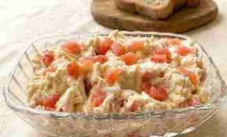 Рыбу нарезаю мелкими кубиками. Часть откладываю для украшения. Натёртые яйца соединяю с маслом, майонезом и горчицей. Вмешиваю рыбу.
