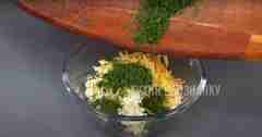 Для начинки соединяю натёртый плавленный сыр, твёрдый сыр, чеснок (через пресс) и нарезанную зелень. Заправляю ложкой майонеза.