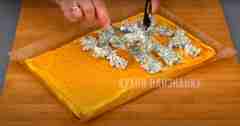 На остывший корж выкладываю начинку, распределяю равномерно и сворачиваю в рулет.