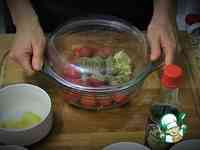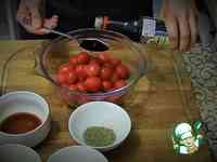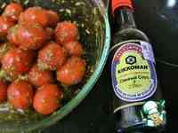 Переложить помидоры в миску или контейнер с крышкой. Влить соевый соус, бальзамический уксус и оливковое масло.