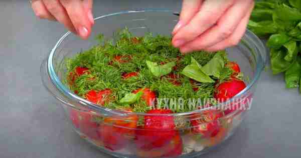 Посыпаю помидоры нарезанной зеленью. Обязательно беру для этого рецепта укроп.