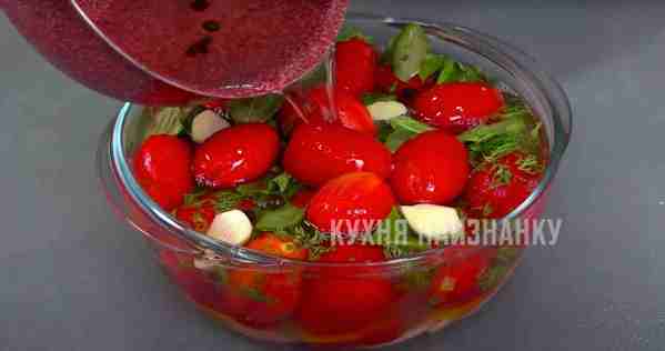 Заливаю помидоры остывшим маринадом и оставляю на столе на сутки. Затем убираю в холодильник. Через сутки помидоры уже готовы.