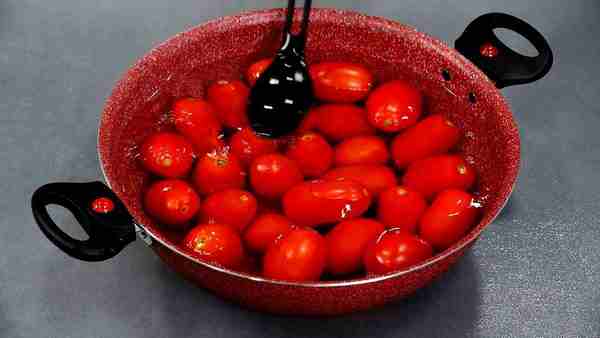 Выкладываю помидоры в подходящую емкость и заливаю кипятком на пару минут.