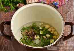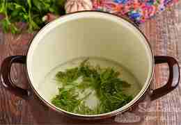 В кастрюлю вливаем воду, растительное масло и уксус. Веточки укропа разрезаем на несколько частей и отправляем в кастрюлю.