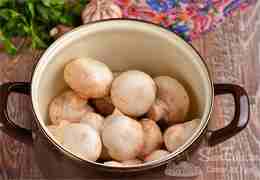 Для приготовления берем небольшого или среднего размера шампиньоны. Промываем и обновляем срез у ножек.