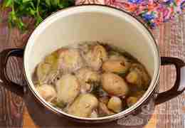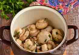 Шампиньоны за 5 минут уменьшатся в объеме и выделят много жидкости. Остужаем в кастрюле на столе.