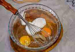 Для основы в миску вбейте куриные яйца, добавьте сметану, соль и перемешайте до однородности.