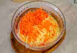 В яичную смесь добавьте натертую на мелкой терке морковь и на средней терке - сыр. Тщательно перемешайте.