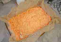 Достаньте испеченную сырно-морковную основу, переверните на доску и снимите пергамент. Дайте ей остыть.