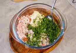 Тщательно перемешайте начинку, посолив и поперчив по вкусу. Для того чтобы сырок и крабовые палочки легче было натереть, слегка их подморозьте.