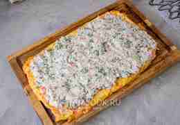 Затем на остывшую основу равномерно распределите начинку ровным слоем.