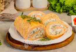 Готовый морковно-сырный рулет с начинкой освободите из пленки, нарежьте на кусочки и подавайте охлажденным.