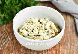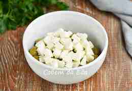 Сыр брынза нарезаем на небольшие кубики и выкладываем на оливки. Использую мягкий сыр, который продается в ванночках.