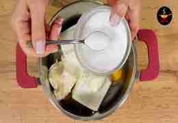 В кастрюлю с толстым дном кладём 0,5 кг творога, 2 яйца, 100 г размягчённого сливочного масла, 1 ч.л. соли (без горки), 0,5 ч.л. соды и 1/4 ч.л. лимонной кислоты. Творог лучше брать не зернистый, а в пачках.