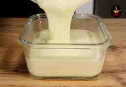 Переливаем горячий сыр в стеклянную баночку или контейнер. Пока он горячий, он будет довольно жидким – это нормально.
