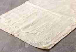 Берем 1 лист тонкого лаваша весом около 100 г и раскладываем на столе. Равномерно смазываем его всем соусом, доходя до краев. Это важно, чтобы лаваш не был сухим после сворачивания.