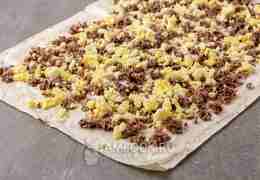 Открываем банку консервированного тунца 250 г. Жидкость полностью сливаем. Рыбу разминаем вилкой до мелких кусочков и выкладываем тонким слоем по всей поверхности лаваша.