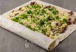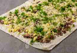 Теперь аккуратно и плотно сворачиваем лаваш в рулет. Поджимаем, чтобы не было пустот. Заворачиваем в пленку или пергамент и убираем в холодильник хотя бы на 30 минут, чтобы рулет схватился.