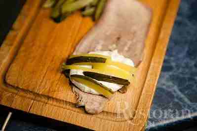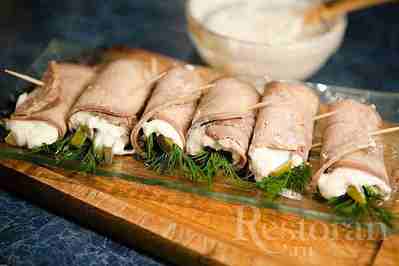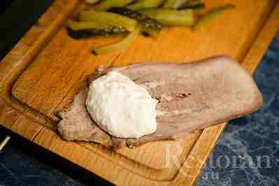 На край кусочка языка кладем чайную ложку с горкой творожно-хренной начинки.