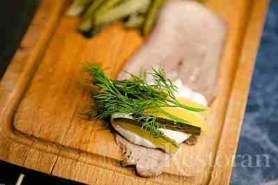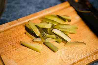 Далее выкладываем ломтики огурца (4-5 шт.) таким образом, чтобы они слегка "свешивались" с кусочка языка, на пару миллиметров.