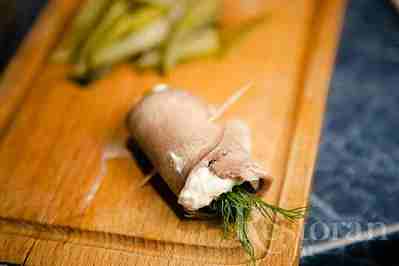 Аккуратно от себя заворачиваем рулетик и скрепляем зубочисткой.