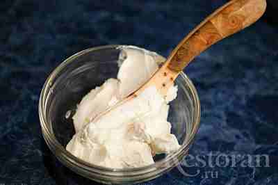 Сливочный сыр выкладываем в мисочку. Я покупаю сыр пониженной жирности Natura. Можете взять любой, без добавок.