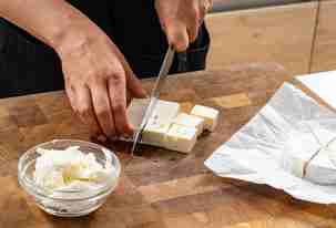 Камамбер разрезать на 8 частей. Фету нарезать кубиками. Моцареллу порвать на кусочки.