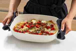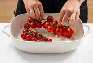 Слегка смазать форму для выпечки оливковым маслом и выложить в нее помидоры и раздавленные зубчики чеснока.