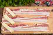 Брусочки сыра выкладываем на полоски бекона (20 шт.). Бекон можно использовать сырой или сырокопченый, как у меня.