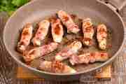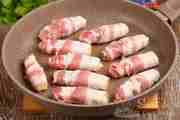 Сыр заворачиваем в бекон, итого 20 заготовок. Заготовки можно сделать заранее. Если готовим на сковороде, то выкладываем заготовки швом вниз на разогретую сковороду без масла партиями по 10 шт.
