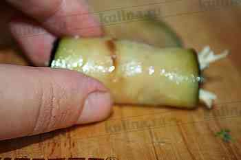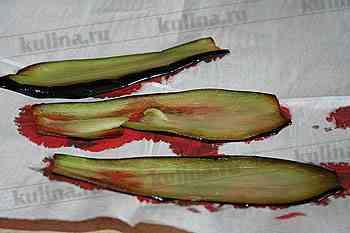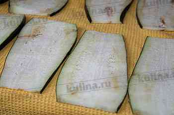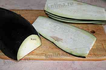 У баклажанов отрезать "попки", нарезать на одинаковые ломтики толщиной 0,5 мм.