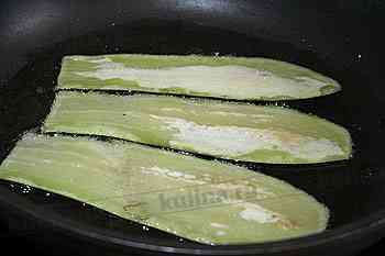 На сковороде разогреть масло и обжарить ломтики баклажанов до золотистого цвета.