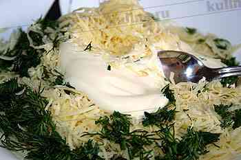 Для начинки натереть сыр на мелкой терке, укроп мелко нарезать, чеснок натереть. Соединить все ингредиенты и