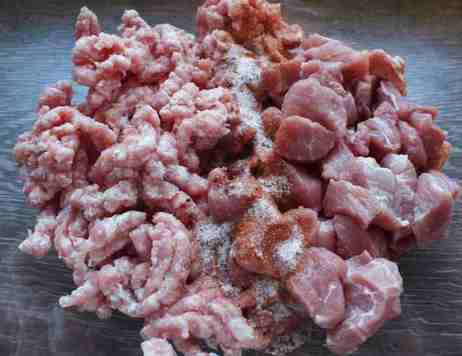 Смешиваем специи, сахар, нитритную соль и добавляем к фаршу. Фарш перемешиваем, накрываем пленкой и оставляем в холодильнике на 2 суток созревать.