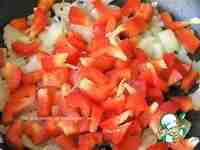 На смеси растительного и сливочного масел обжарьте нарезанный лук, добавьте красный перец, перемешайте, продолжая обжаривать.